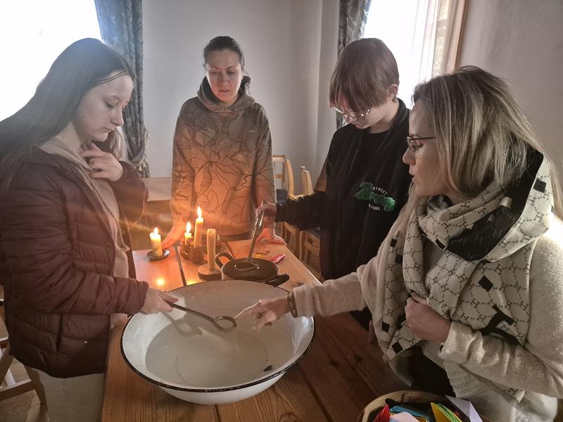 Celem zajęć było przedstawienie postaci świętych – opowieść o ich życiu, oraz tradycyjne wróżby andrzejkowe takie jak: lanie wosku przez klucz i odczytywanie wróżby andrzejkowej, ustawianie butów, puszczanie świeczek na wodę… Zgodnie z tradycją święta Katarzyna miała być opiekunką cnotliwych kawalerów zaś święty Andrzej opiekował się pannami na wydaniu. Potem w Skansenie w Radomiu – jednym z piękniejszych – podziwiałyśmy wiele zabytków dawnego budownictwa wiejskiego, wśród nich były: chałupy (z XIX, XVIII wieku), dwory, kościół, budynki gospodarcze, kuźnie, wiatraki i młyny wodne. Muzeum pełne jest także eksponatów ruchomych: pojazdów, maszyn rolniczych, uli i narzędzi pszczelarskich, tkanin oraz sztuki ludowej.