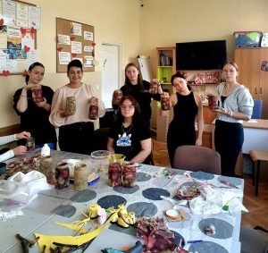 Podczas zajęć koła plastycznego wychowanki wykonywały lampiony z wykorzystaniem słoików serwetek, bibuły, sznurka, światła led. Celem zajęć było rozwijanie kreatywności, cierpliwości, umiejętności współpracy w grupie.