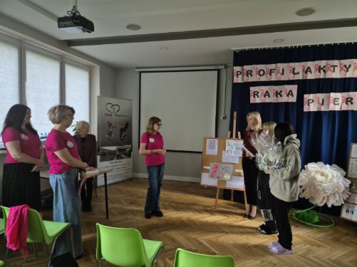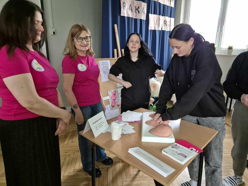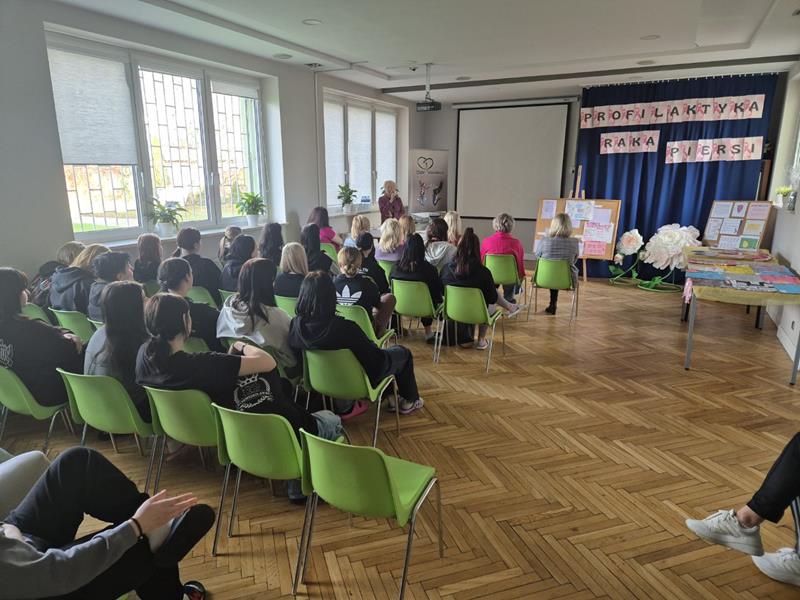 Pani dr Danuta Krajewska omówiła najważniejsze czynniki ryzyka, kwestię budowy piersi, objawy nowotworu piersi, diagnostykę oraz profilaktykę. Rak piersi jest jednym z najważniejszych problemów zdrowotnych u kobiet w Polsce. To częsty temat w mediach i debacie publicznej. Natomiast zaawansowany rak to niestety wciąż temat tabu, dlatego należy mówić o tym głośno. Podejmowane przez nas przedsięwzięcia mają na celu kształtowanie wśród naszych wychowanek zdrowych nawyków, które wpłyną na zmianę statystyk mówiących o tym, że co roku prawie 1/3 kobiet umiera z powodu zbyt późnego wykrycia choroby. Prelekcja została uzupełniona prezentacją technik samobadania piersi na fantomie, który pokazuje typowe nieprawidłowości chorobowe piersi. Dziewczęta wykazywały duże zainteresowanie zagadnieniami z zakresu profilaktyki oraz nauką prawidłowej techniki samobadania piersi. Po tych zajęciach wszystkie się zgodzimy, że lepiej zapobiegać niż leczyć. Podczas spotkania został rozstrzygnięty również konkurs plastyczny pn. „Badanie dotykiem – najlepszym zdrowym nawykiem” zorganizowany w ramach realizacji zadań z zakresu profilaktyki nowotworowej.